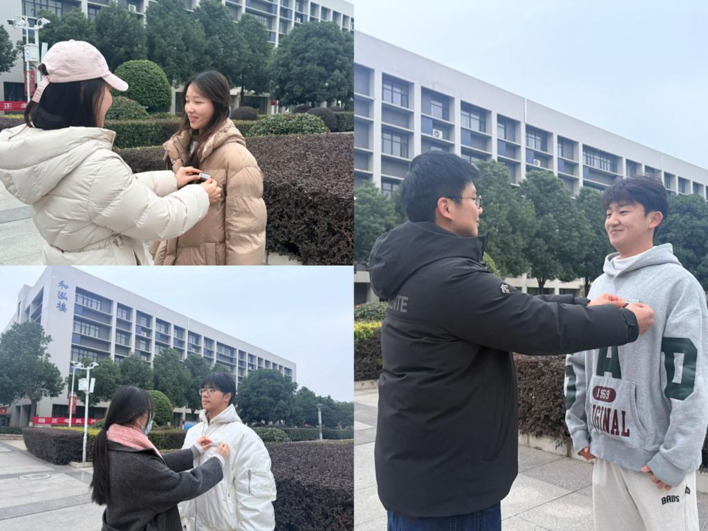 仪式尾声,辅导员面带温和而郑重的笑容,缓步走到学生代表面前。他从礼仪托盘中拿起一枚崭新的校徽,双手捧着,小心翼翼地为学生代表别在胸前衣襟正中,又抬手轻轻抚平校徽边缘的褶皱,随后紧紧握住对方的手,眼神里满是赞许与欣慰。阳光下,校徽熠熠生辉,映照着少年挺拔的身姿与坚定的目光,台下再次响起经久不息的掌声。
